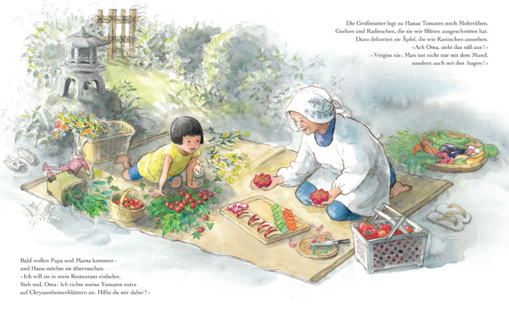 Ich bin in einem kleinen friedlichen Dorf in Gifu aufgewachsen, eine Präfektur, die ziemlich mittig in Japan liegt. Dort gab es viele weite Ebenen und als Platz zum Spielen hatte ich nur Felder und die Natur. Als ich 7 Jahre alt war, verstarb mein Vater durch eine Krankheit und meine Mutter und Großmutter fingen an zu arbeiten, dadurch verbrachte ich viel Zeit allein in der ländlichen Natur. Wahrscheinlich hatte ich schon seit dieser Zeit eine Sehnsucht nach fremden Ländern, denn ich träumte davon, die Welt zu sehen, wenn ich erwachsen bin. Als Kind bestand mein Alltag allerdings darin, jeden Tag über alle vier Jahreszeiten hinweg meiner Mutter, die Gemüse anbaute, auf die Felder zu folgen und dort zu spielen. Der Geschmack von frischen Tomaten und Gurken, die auf dem Feld geerntet wurden, von Kakis und Feigen, die ich von den Bäumen gegessen habe, sowie die Aromen, die Formen und die Farben der verschiedenen Gemüsesorten haben mich geprägt. Auch heute, wenn ich auf dem Markt denselben Geruch von Tomaten wie damals als Kind wahrnehme, ist das für mich ein Moment des Glücks. Heute lebe ich in Paris, reise durch verschiedene Orte und gestalte Bilderbücher, die in unterschiedlichen Ländern spielen. Doch immer, wenn ich nach 30, 40 Jahren, nachdem ich meine Heimat verlassen habe, dorthin zurückkehre, arbeitet meine Mutter wie damals auf dem Feld und baut Gemüse an. Als ich ein Bilderbuch illustrieren wollte, das in Japan spielt, war das erste, was mir einfiel, die Tomaten vom Gemüsefeld meiner Mutter.